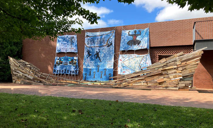 Underway (Overall View), 2016, repurposed lumber & hardware, 8 x 42 x 8 ft. / 96 x 504 x 96 in.