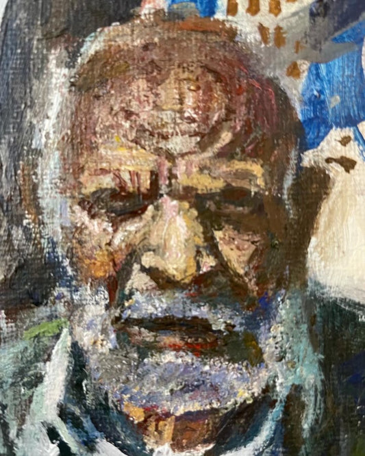Bill Traylor with His Work, 2022, acrylic on canvas, 16 x 20 in. / 40.64 x 50.8 cm.