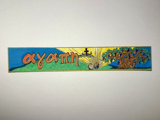 θεός (God) & ἀγάπη (Agape), 2025, mixed media, 10 x 2 in. / 25.4 x 5.08 cm.