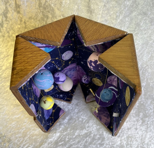 Across the Universe 3, 2023, mixed media, 3 x 7.5 x 1.5 in. / 7.62 x 19.05 x 3.81 cm.