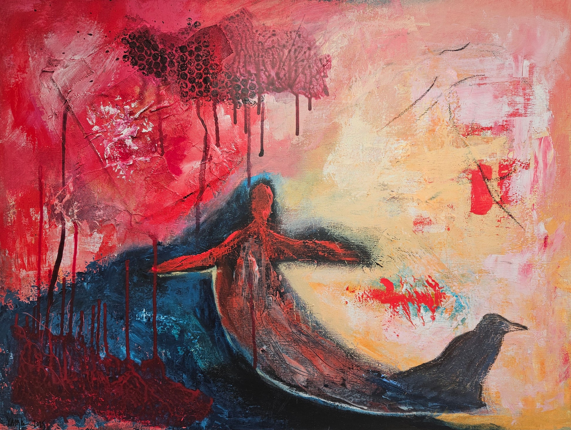 A Dream of a Girl and a Raven, 2024, acrylic, 60 x 60 cm. / 23.62 x 23.62 in.