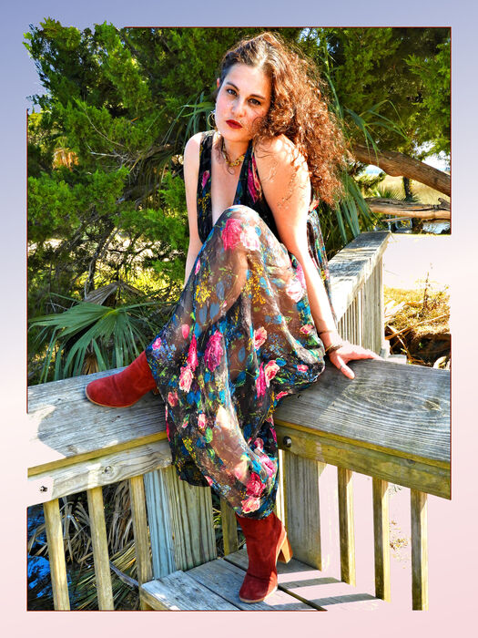 My friend and occasional model who is a fairly well-known fashion historian sitting on a railing in Hickory Mound. Fl. Big Bend WMA. This image is part of a series using integrated backgrounds and illuminated outlines to create portraits and other people images.