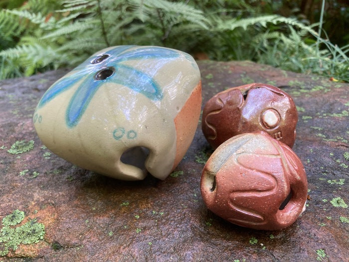 Bells: Entangled Particle Wave Functions, 2025, wood fired ceramic, 2.5 x 3 x 3 in. / 6.35 x 7.62 x 7.62 cm.