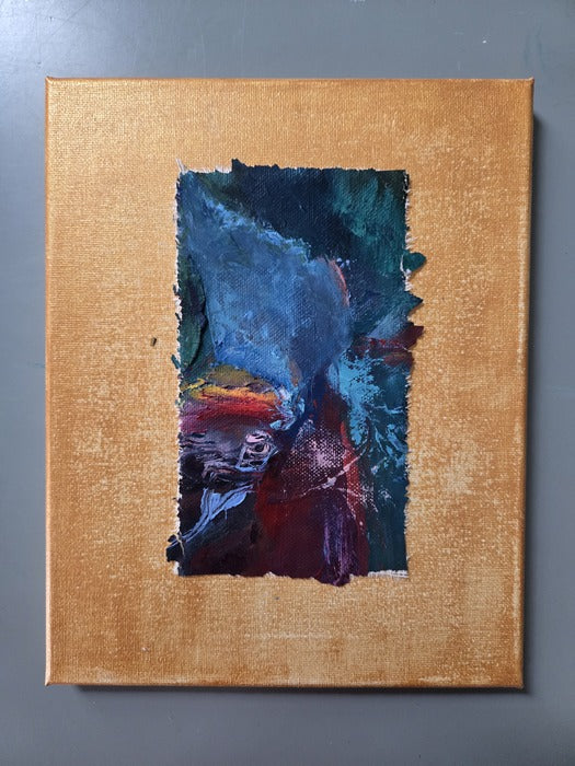 from an incomplete oil painting mine, resulting in an image of chaos by color and size; image placed on painted canvas