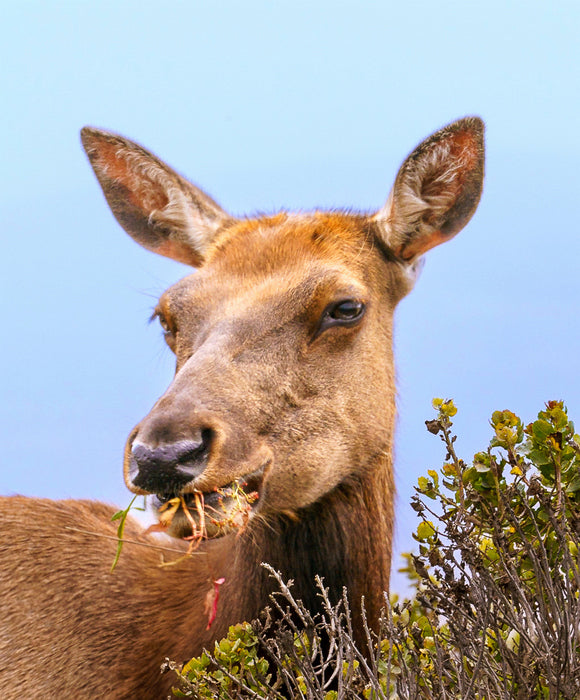 Tule elk cow enjoys her breakfast