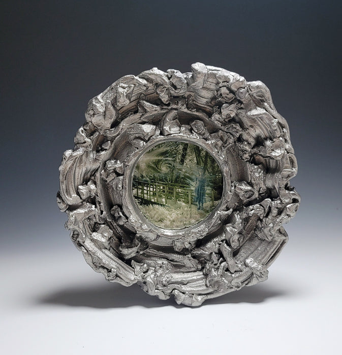 Stoneware, cone 10, metallic oxide pigment and computer-generated photo image transfer on a wall-mounted, three-dimensional ceramic form.