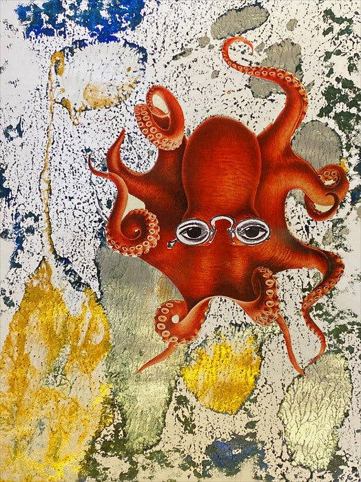 This is part of a collage series I constructed while living on Cape Cod, MA. I poured sand on top of an inked plate and printed it, then added the (public domain) images of octopus & glasses. It seems both whimsical and appropriate to put scholarly glasses on an octopus.