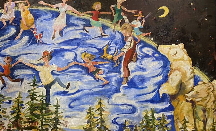 A circle of men, women and children dance joyfully on our blue planet as two bears look on.