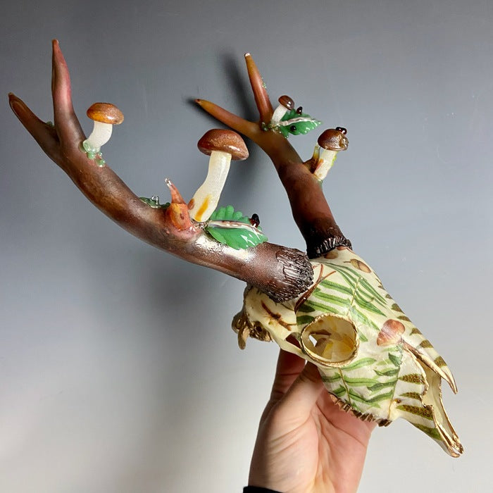 Deer Skull Colab with Artist Emmanuelle Jobidon, 2024, real deer skull, paper, and blown glass, 12 x 12 x 10 in. / 30.48 x 30.48 x 25.4 cm.