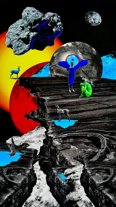 Figures gather at the edge of a fractured world as celestial bodies rise. “Echoes from the Beginning (Arrival)” imagines the birth of time—where myth, memory, and matter converge in a strange new world.