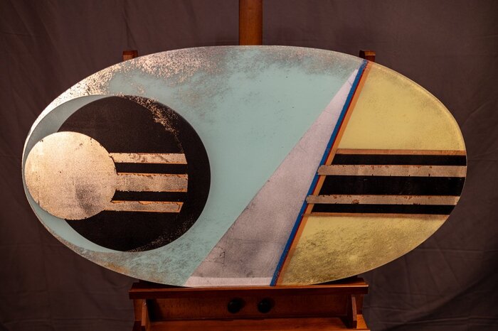 Eclipse, 2024, etched mirror, imitation silver leaf, paint, matte coating, 39 x 22 in. / 100 x 55.88 cm.