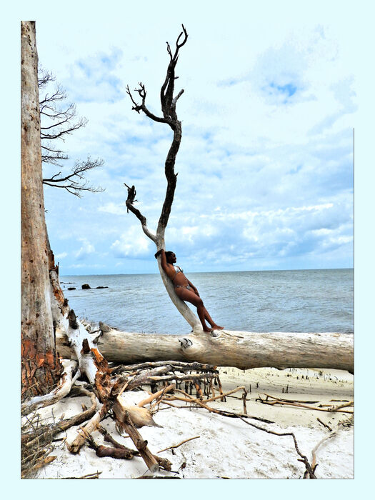 Perched atop a sun and salt bleached tree log, the individual peers out at the ocean horizon. This image is part of a series using integrated backgrounds and illuminated outlines to create portraits and other people images.