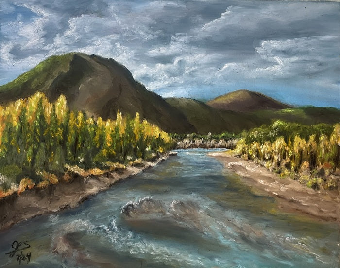 FLATHEAD RIVER IN GLACIER NATIONAL PARK, 2024, soft pastels, 11 x 14 in. / 27.94 x 35.56 cm.