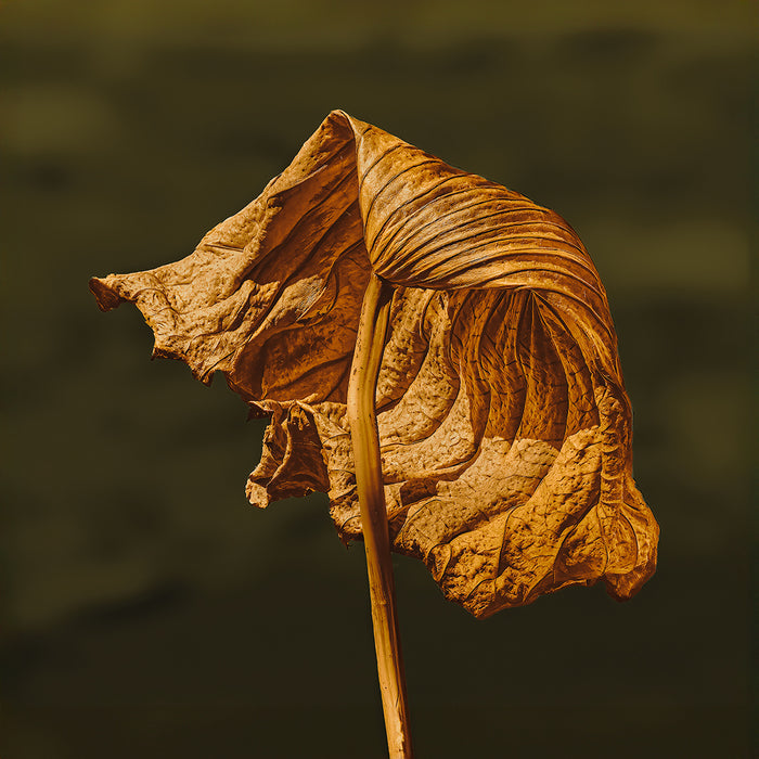 In this image, the dried lily pad leans gracefully inward, its weathered surface accentuated by soft, golden light. Intricate folds and flowing lines create a sense of quiet introspection, as though the leaf is drawing into itself. Its stem, still upright, supports the weight of its delicate