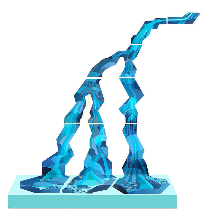 The Giant Waterfall is constructed out of MDF so that waterfall tumbles down the wall with the waterfall pool landing on a 3 D plinth on the floor, was designed as the centre piece to my solo exhibition in London on the theme of H2O. I have a studio in Bergerac, France and often visit the mountain