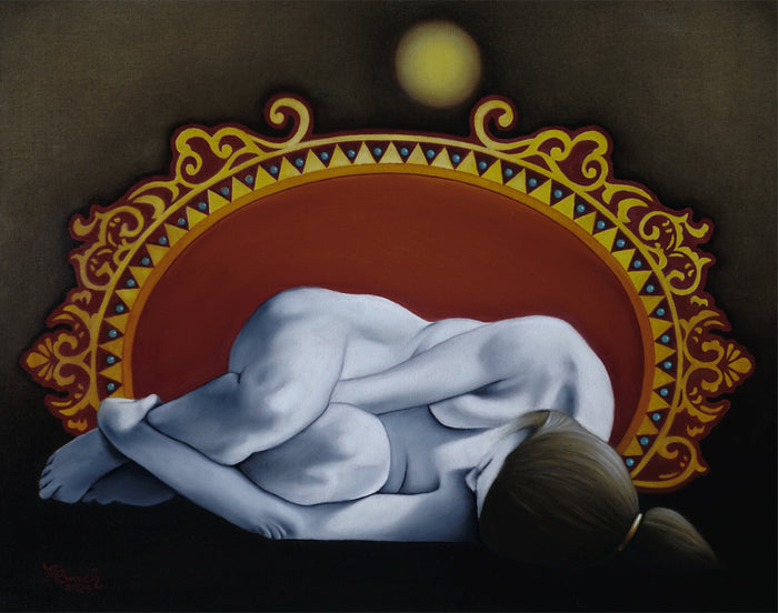 Nude in front of oval decorated frame with sun rising behind it