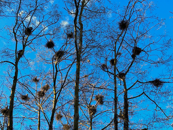 Every spring Great Blue Herons return to a Seattle park to form a rookery with about 80 nests. Here, against the blue sky, the nests appear like giant Christmas tree ornaments.