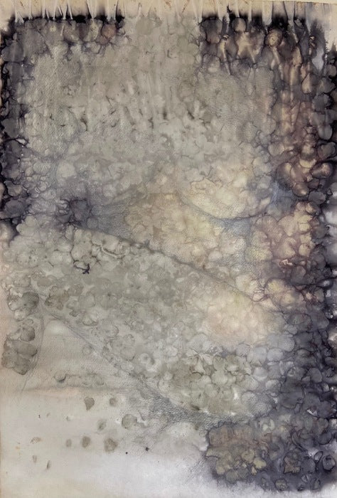 Fabriano watercolor paper stained with hydrangea and rose petals and enhanced with graphite, sumi ink and watercolor.
