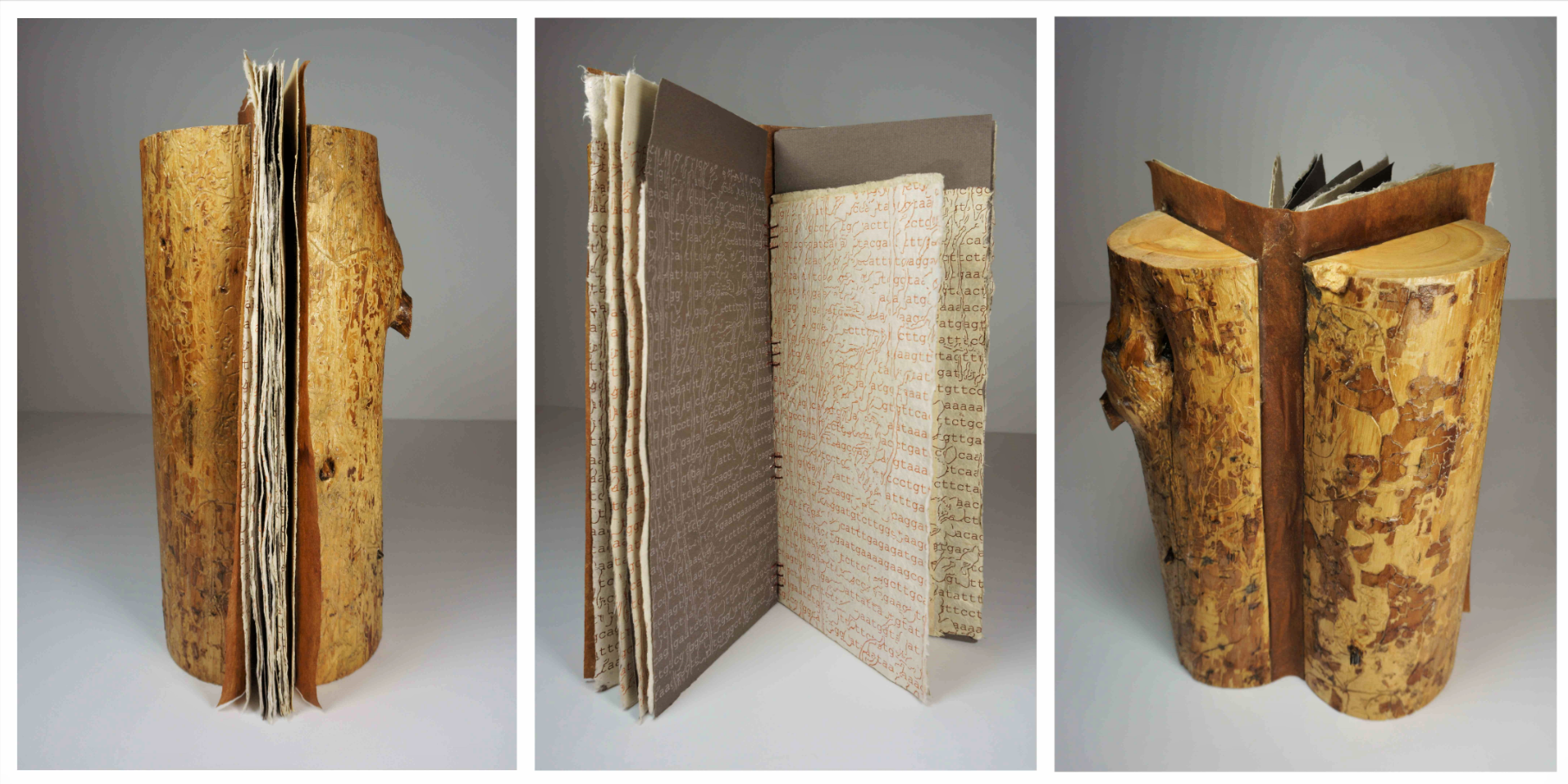 Artist book based on a paper by Six et al.: ~25% of lodgepole pines in a research tract survived mass attack by mountain pine beetles. DNA analyses of the survivors showed less encoding for certain VOCs that the beetles perceive. The interior pages of the book have been printed with "ASCII art" of the mRNA base pairs for the gene that turns of monoterpene synthase. The proportion of dark, low-contrast ("quiet") to light, high-contrast ("noisy") pages in the book is 25/100.