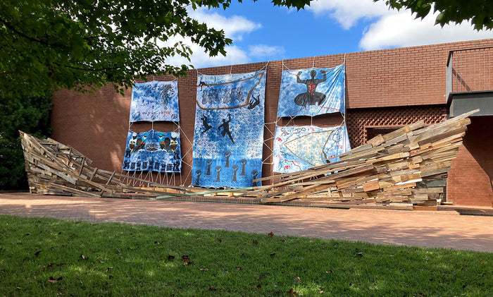 Human Cargo, 2021, repurposed lumbar and hardware, 8 x 47 x 6 ft. / 96 x 564 x 72 in.