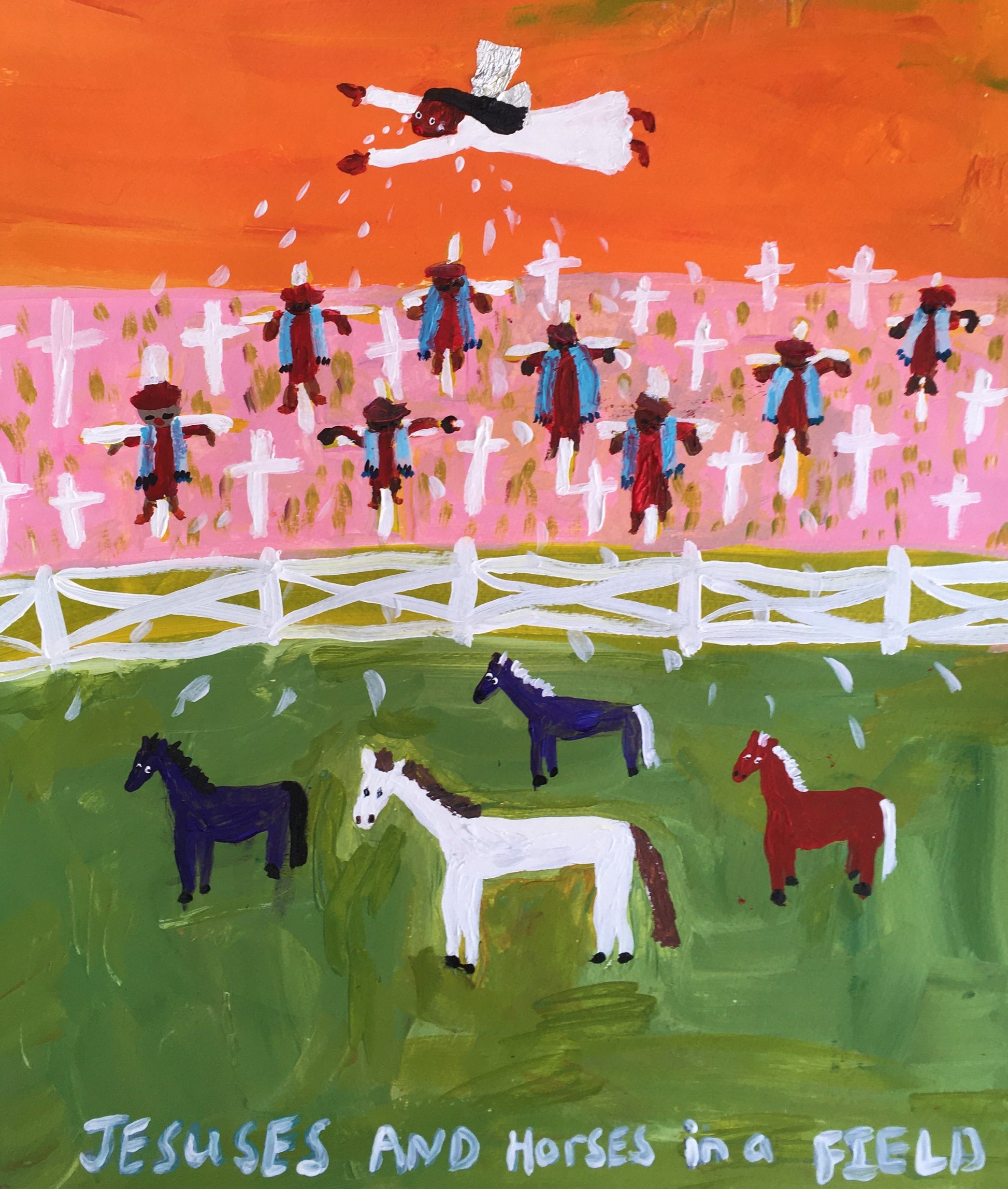 Jesuses and Horses in a Field, Jennifer Moses, 2022, mixed media on paper, 22 x 18 in. / 55.88 x 45.72 cm.