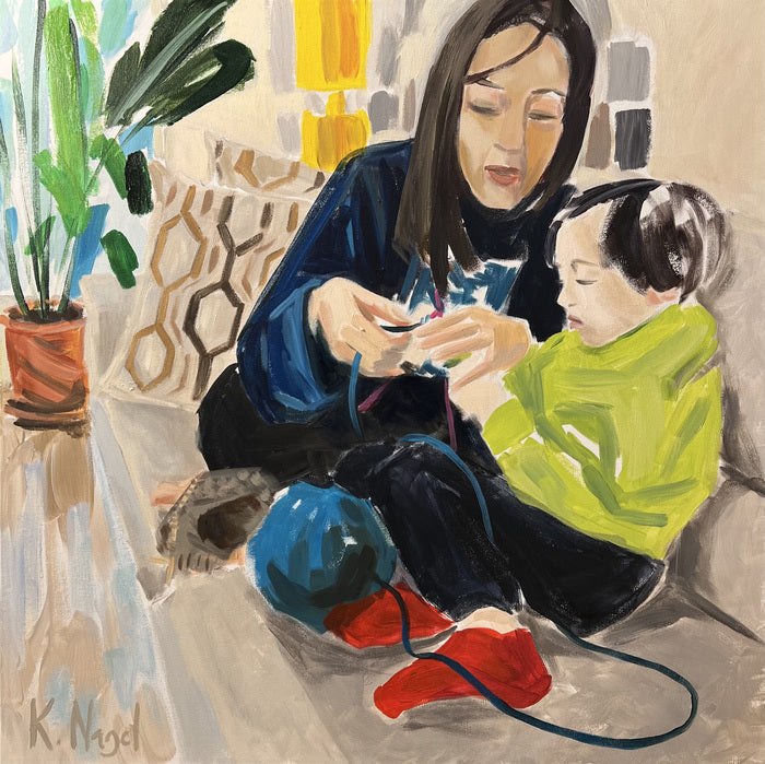 Knitting Lesson, 2022, oil and acrylic on canvas, 30 x 30 in. / 76.2 x 76.2 cm.