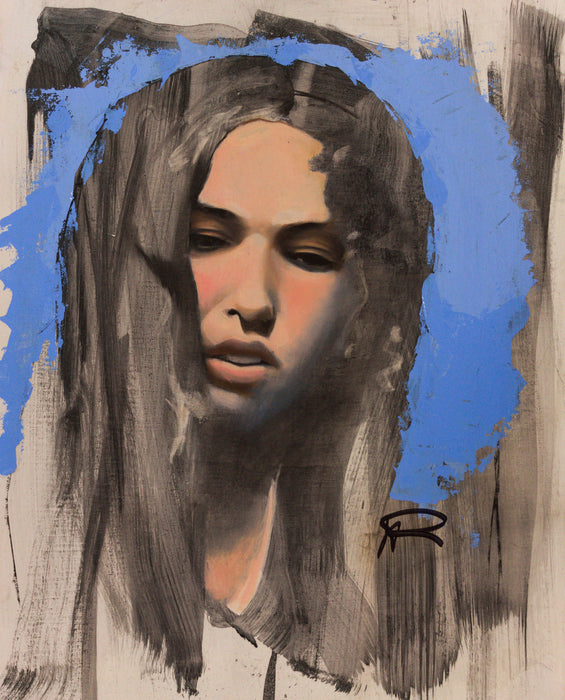 This painting blends oil, charcoal, and acrylic to create a mesmerizing portrayal of a person whose features transcend traditional notions of women and gender. The artist’s skillful layering of mediums evokes depth and texture, with the bold strokes of charcoal adding definition and intrigue.