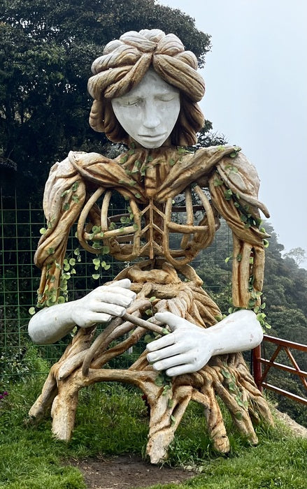 A mist-covered sculpture of a woman rises from intertwined roots and branches, her calm white face and hands contrasting the wild wooden form. She appears as a serene forest guardian, both created by nature and protecting it, poised between myth and the living earth.
