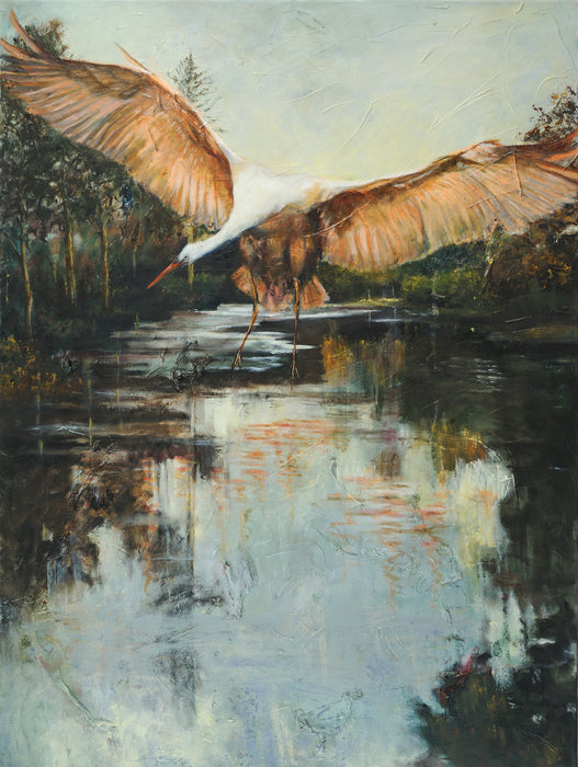 Lake with Bird, Tinam Valk, 2021, mixed media on canvas, 40 x 30 in. / 101.6 x 76.2 cm.
