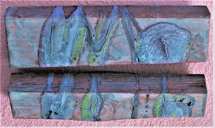 Copper and bronze metal effects paint poured over cleaved wood. sprayed with reagent to oxidize to lovely shades of blue and green. understated reference to contemporary life as we all have been "interrupted" by COVID.