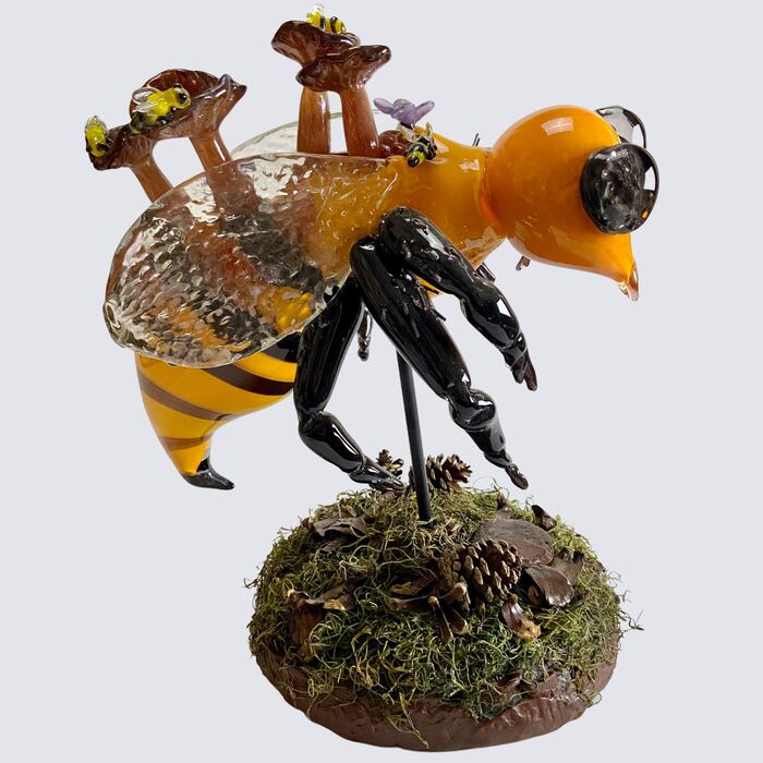 Metarhizium, Sarah Band, 2023, hot-sculpted glass, preserved moss, found plant life, 16 x 14 x 11 in. / 40.64 x 35.56 x 27.94 cm.