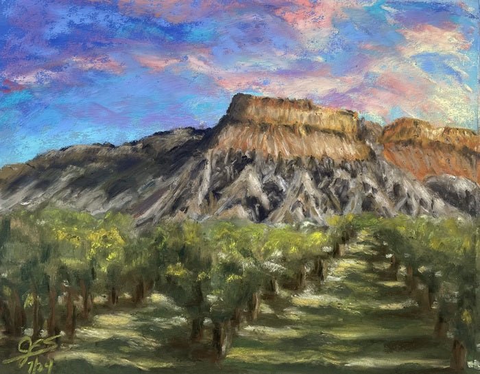 This is a soft pastel painting of Mount Garfield looking across the rows of fruit trees in Palisade, Colorado near Grand Junction. This is the home of the locally famous Palisade peaches and the Colorado wine country. It is a fun place to visit in the west of Colorado near Utah.
