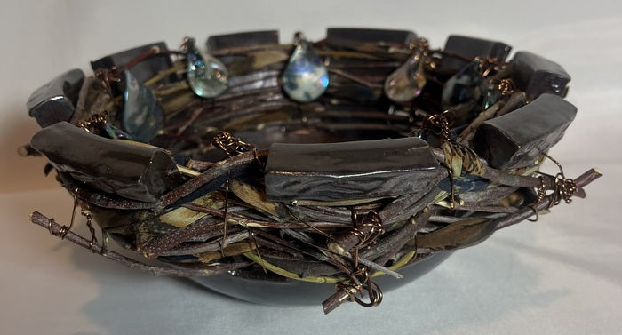 Ceramic bowl with 9 vertical cut-out ribs through which strands of silk and river birch twigs have been woven. Brass wire is used to secure pieces of shell between each rib and to securely anchor the twigs.