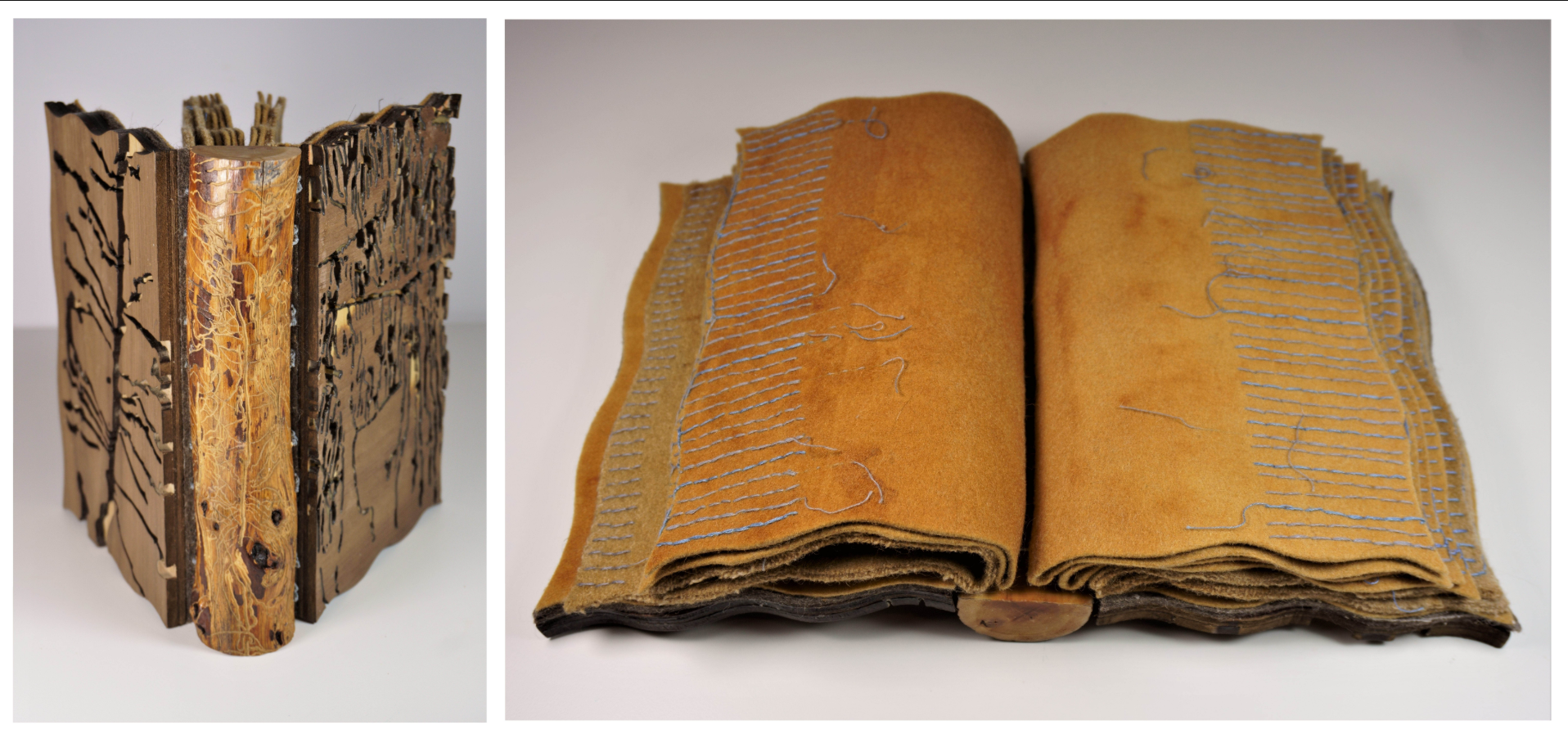 Mountain pine beetles and pinion Ips carry species of fungi on their bodies. The fungi's microfilaments burrow into the wood searching for nutrients. They transfer phosphorus and nitrogen back out toward the surface; without them, these beetles could not digest the wood. The covers represent the beetle galleries; embroidery on the pages represent the fungi, whose grazing leaves a tell-tale stain in the wood--bluer for the mountain pine beetle and greyer for the pinon Ips.