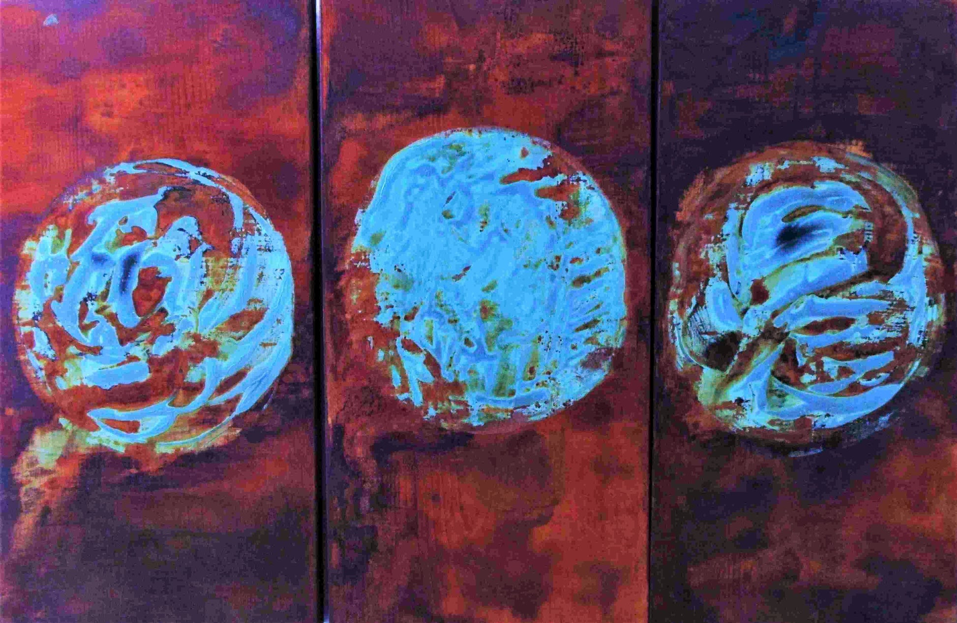 Origins of the Universe, Ed Whitmore, 2018, oxidized iron copper and bronze on wood, 24 x 36 in. / 60.96 x 91.44 cm.