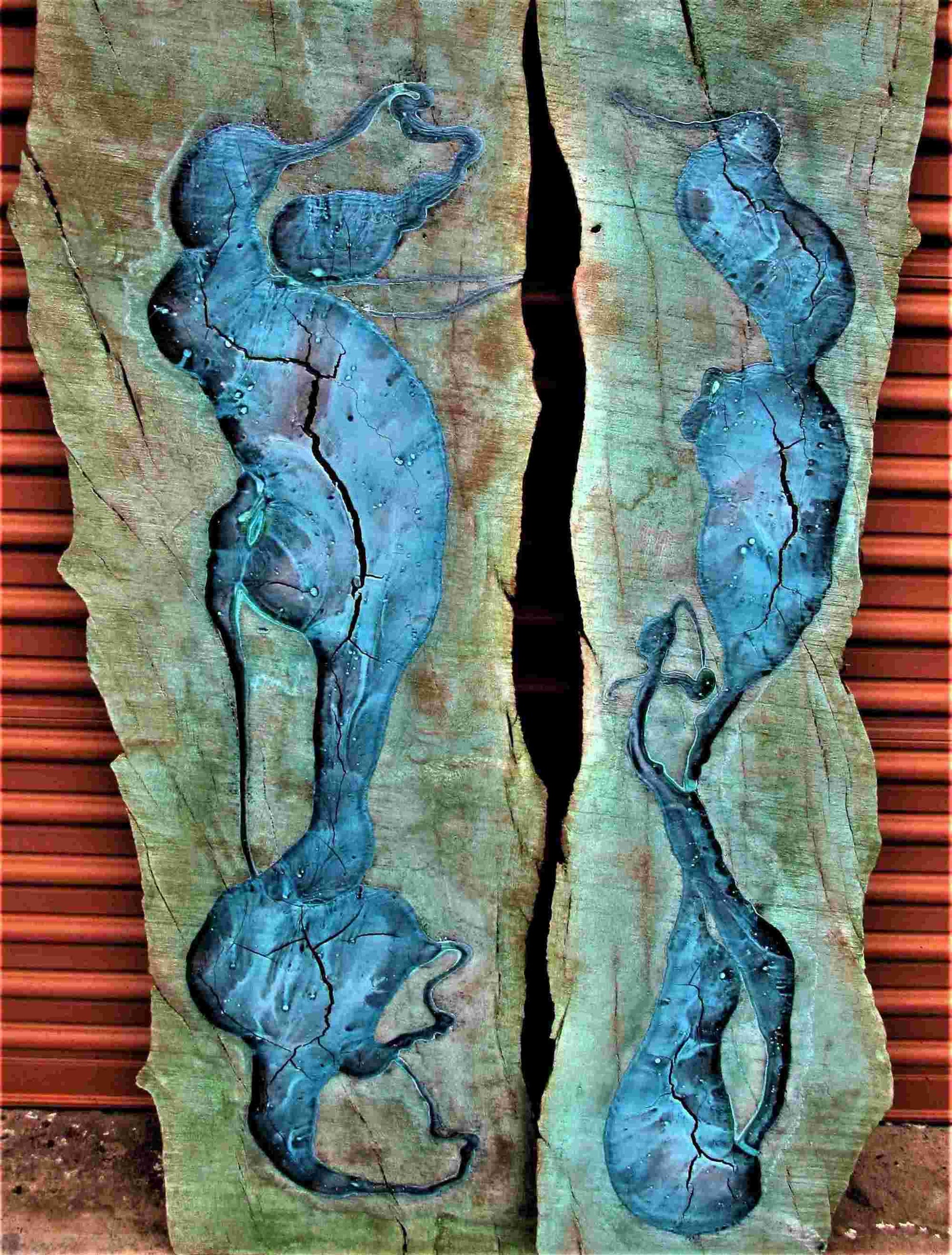 Pair of Cranes, Ed Whitmore, 2022, oxidized copper and bronze on weathered wood, 50 x 30 in. / 127 x 76.2 cm.