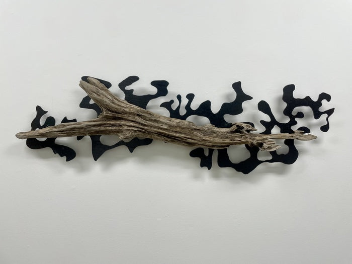 Perspective, Breanna Bercegeay, 2023, steel & driftwood, 16 x 50 x 5 in. / 40.64 x 127 x 12.7 cm.