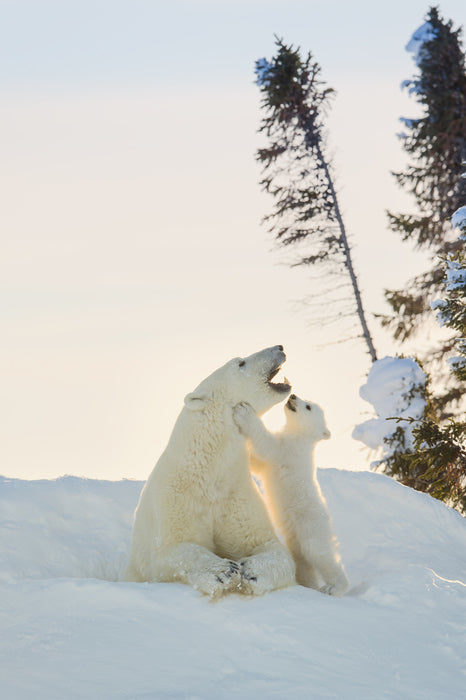 Three-month-old polar bear cub reaching out to its mother, shortly after emerging from their denning bed, Wapusk National Park, Manitoba, Canada, near the Hudson Bay.