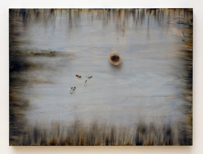 Fire drawing, horsehair nest, feathers, inks torched panel