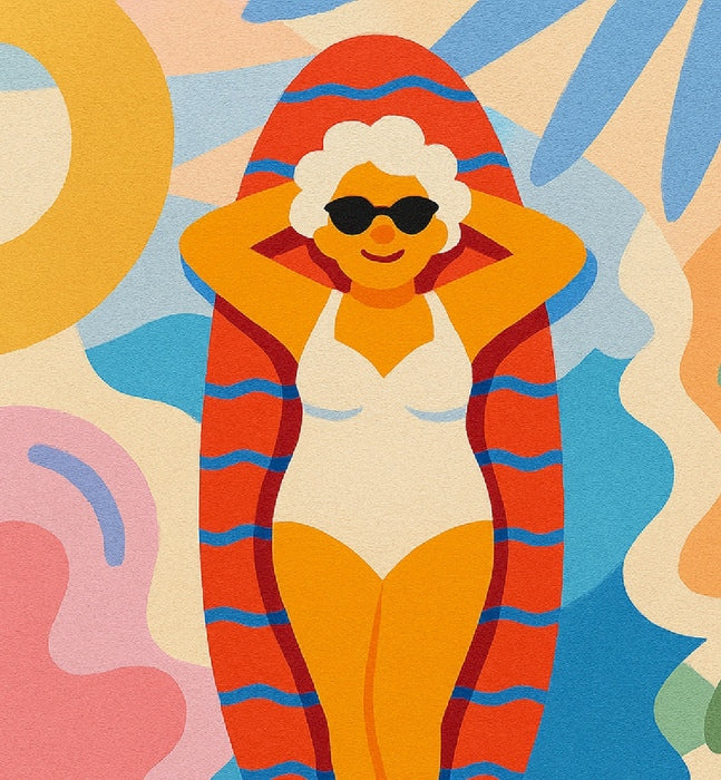 A cheerful and soothing depiction of an elderly woman resting on her back atop a surfboard. With eyes closed and hands behind her head, she radiates peace, confidence, and the joy of being in the moment. Rendered in a stylized flat-color approach, the image gently challenges age stereotypes, present