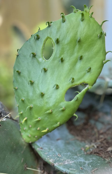 Shaped like a gentle desert turtle, the cactus pad leans forward as if on a quiet journey. Its curved shell-like surface and tiny bumps mimic a slow traveler moving with purpose. Through its openings, light peeks through—whispering that slow and steady truly wins the race.
