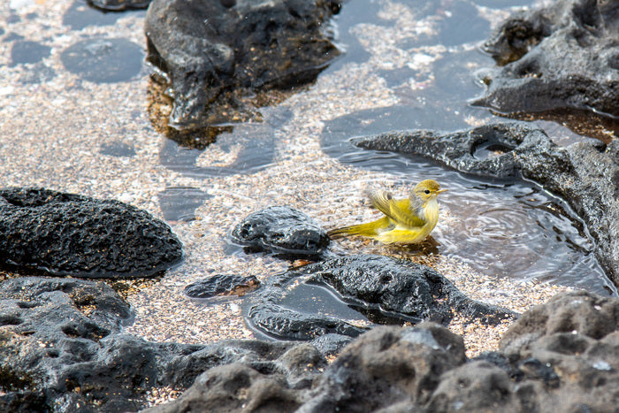 A little bird cleans off in a natural pool of water, created from volcanic rock.