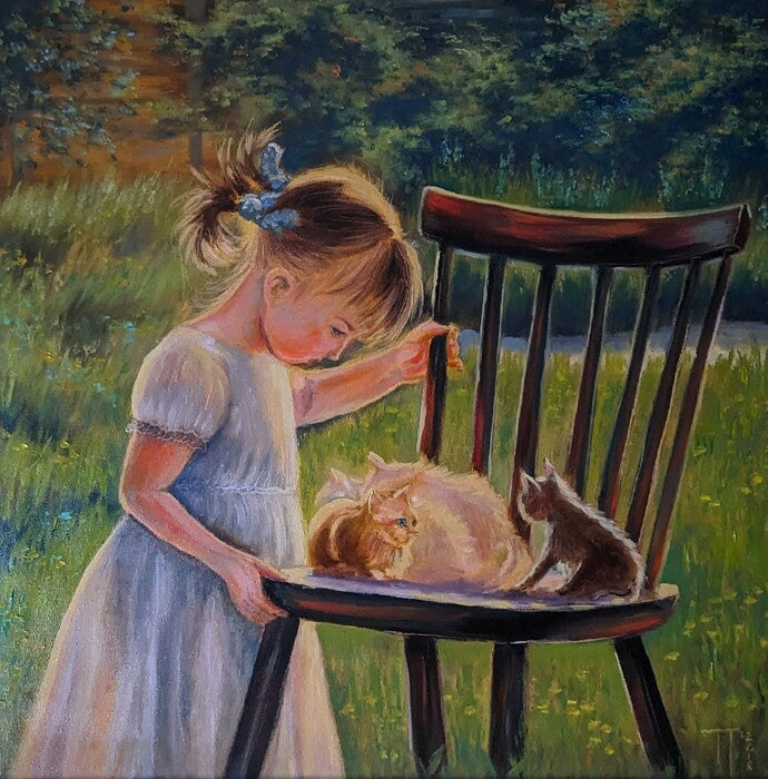 Sunny Days in the Garden: A Playful Scene with Kittens, Tatiana Grace, 2018, oil painting, 20 x 20 in. / 50.8 x 50.8 cm.