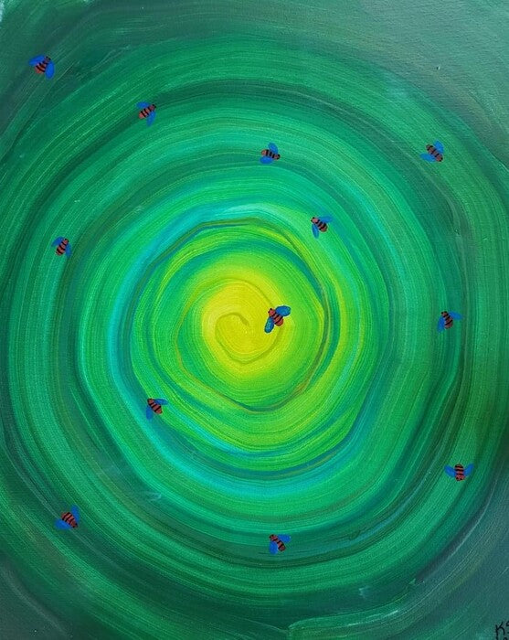 Red/blue bees spiral violently into teal-green chaos, bodies dissolving into brushstrokes. A surreal dance of unity and dissolution—order consumed by primal frenzy.
