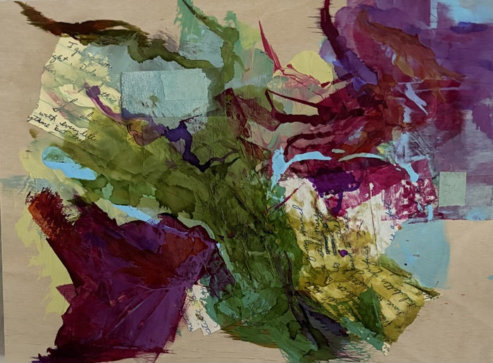 Sweet Memories is a loose abstract inspired with bits of old love letters, ink, acrylic, and paper. I love the magenta-purple with the light blue, greens and yellows. A celebration of love and the memories associated with our early loves.