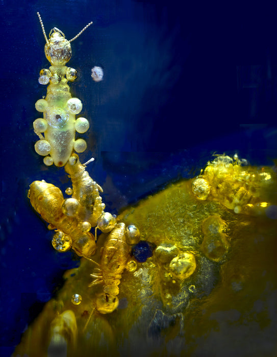 I have been photographing insects embedded in amber for decades. This is a a tropical termite colony in Colombian amber, a few million years old. The upper termite is exuding gases and liquid. Termites are common in amber, as colonies often get trapped in tree sap. They evolved from cockroaches.