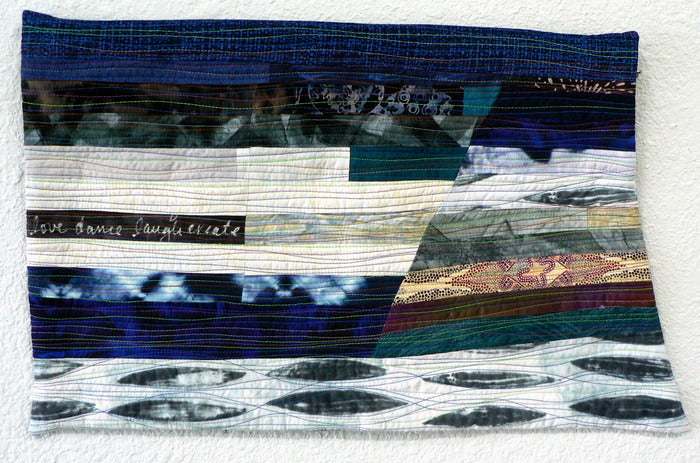 Sleek, silhouetted fish flashing through the sea. Maybe a school of sardines? The piece's irregular shape reminds the viewer of a boat. This is one of a Fish in the Sea series, all featuring the same abstract 'fish school' batik fabric.