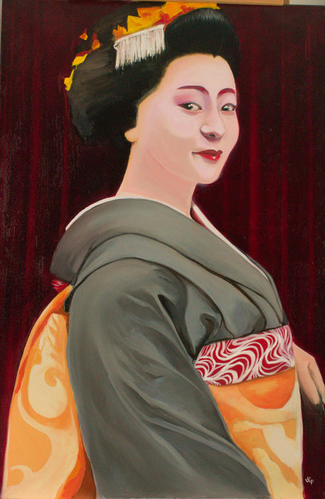 This painting captures the radiant charm of a geisha, her warm smile glowing beneath the intricate elegance of her beautifully adorned garment, rich in color and delicate detail.