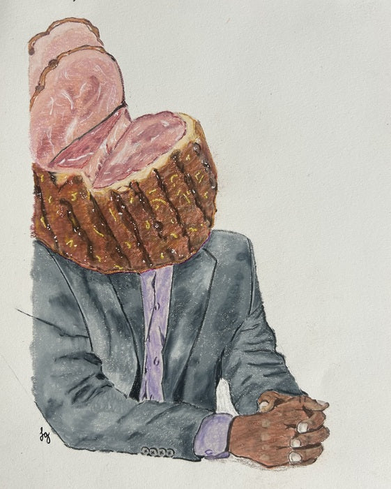 The Ham Man, Sasha Grunza, 2025, colored pencil, 7.5 x 9.5 in. / 19.05 x 24.13 cm.