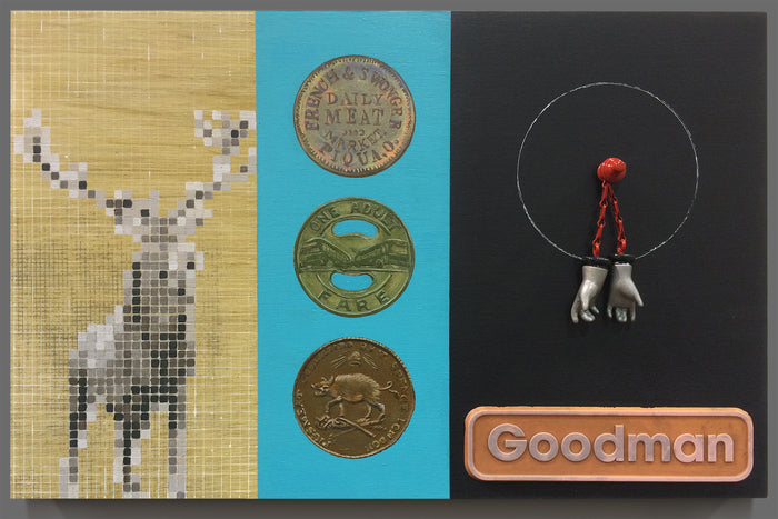 The Miller's Daughter, John Wolfer, 2019, acrylic and found objects on board, 14 x 22 in. / 35.56 x 55.88 cm.